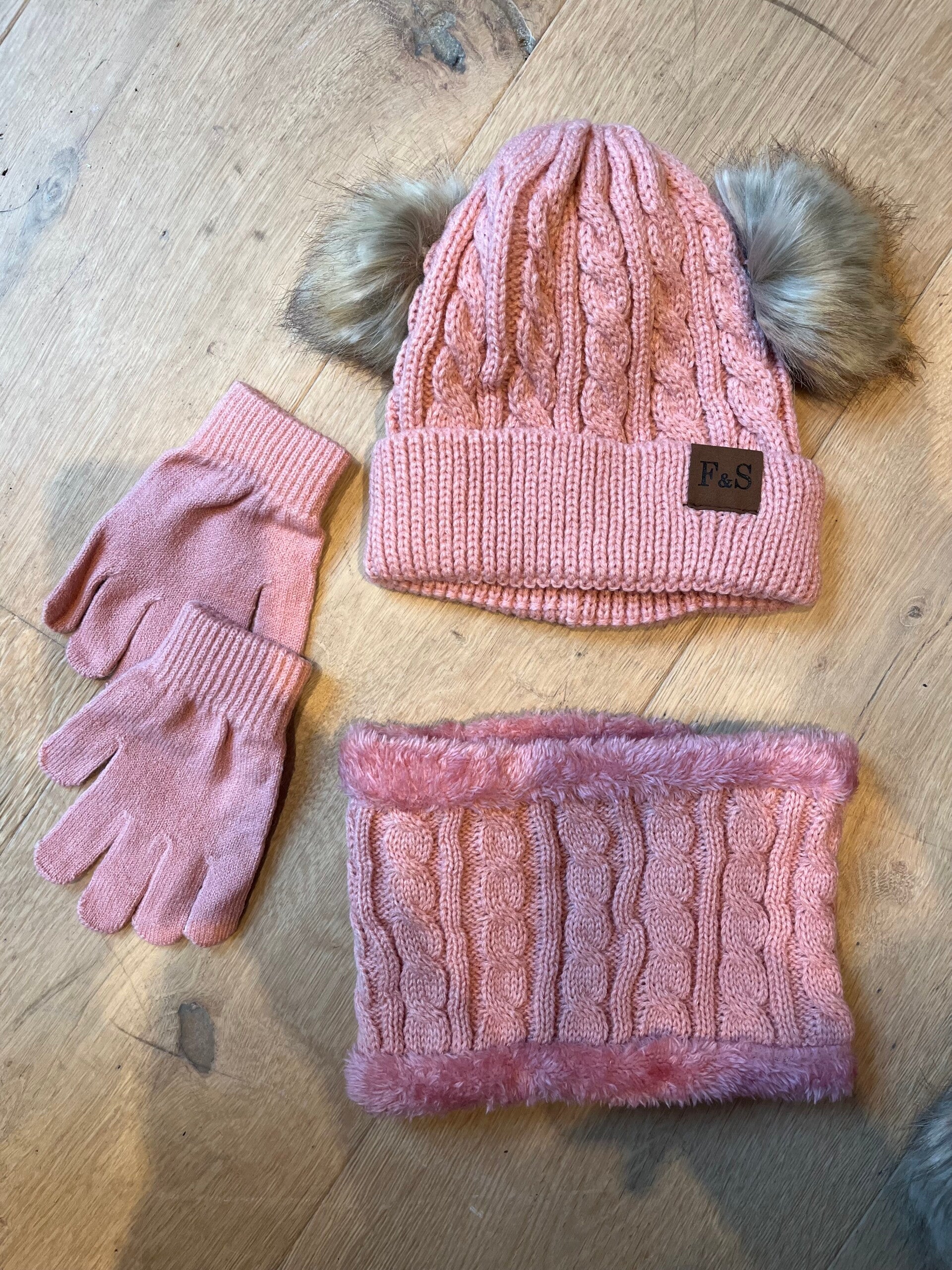 Set muts, sjaal en handschoenen Fas jeans oud roze